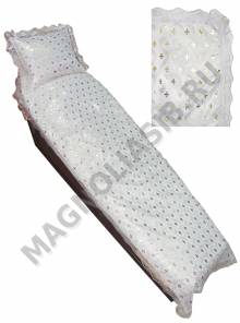 Расцветки: белый. Накат на шёлке : золотые кресты. Размеры: покрывало с кружевом 210 см*80 см и наволочка с кружевом 60 см*40 см.