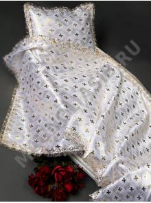 Расцветки : белый, молочный. Накат на атласе золотой рисунок кресты, тюльпаны. Размеры : покрывало с рюшкой 208х78 см, наволочка 50х35 см.В Москве рисунок золотые и серебряные кресты и тюльпаны